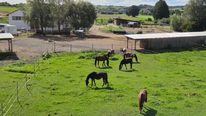 | Anbindemöglichkeit (Balken, Ringe), Wiese zum selbst Einzäunen Plätze: 10 | Sitzgelegenheiten im Freien, Sitzgelegenheiten unter Dach, direkte Sicht zu den Pferden |