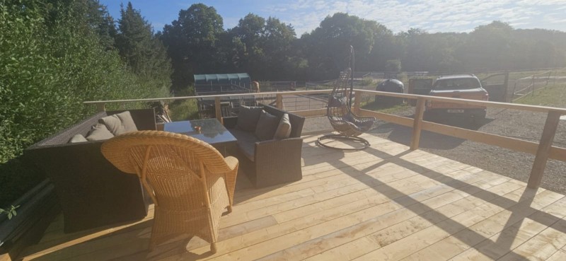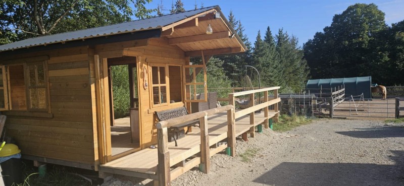 | Pferde können an den Stützpfeilern angebunden werden Plätze: 4 | Sitzgelegenheiten unter Dach, direkte Sicht zu den Pferden, Trockene Aufbewahrung für Sattel/Gepäck |
