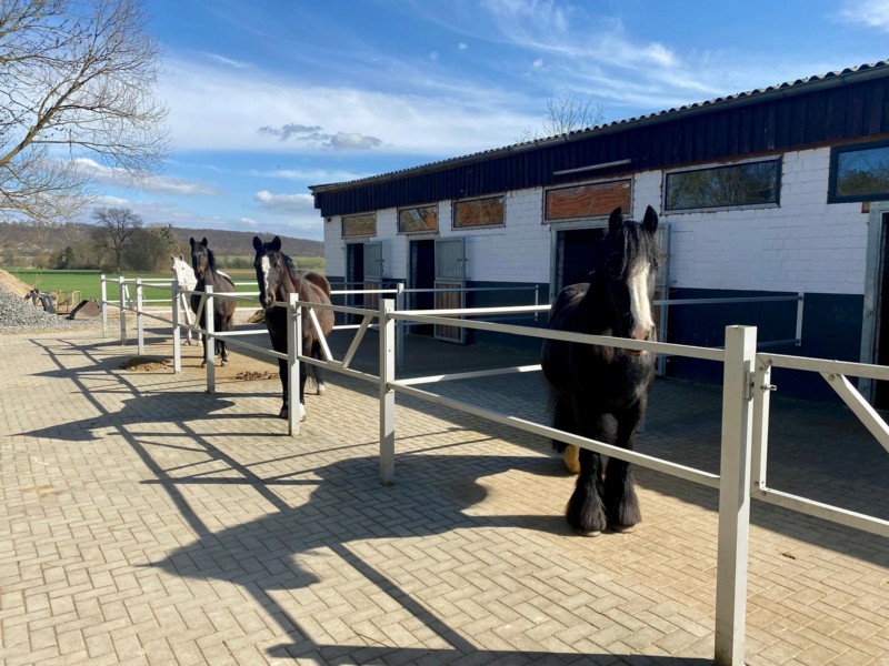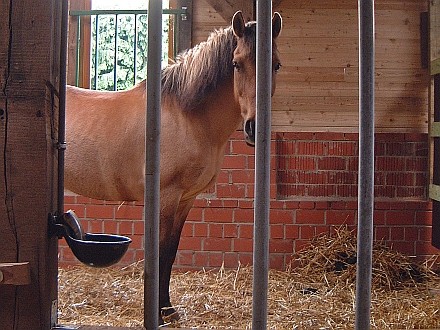 | Anbindemöglichkeit (Balken, Ringe), Boxen/Einzelpaddocks Mistwerkzeug vorhanden, Wassereimer vorhanden | Sitzgelegenheiten im Freien, Sitzgelegenheiten unter Dach, direkte Sicht zu den Pferden Café, Kuchen, Eis, Getränke |