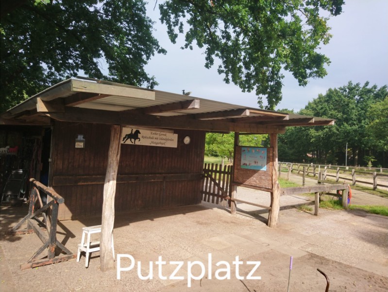 | Anbindemöglichkeit (Balken, Ringe) Plätze: 10 | Sitzgelegenheiten im Freien, Sitzgelegenheiten unter Dach, direkte Sicht zu den Pferden, Trockene Aufbewahrung für Sattel/Gepäck eigene Verpflegung notwendig |