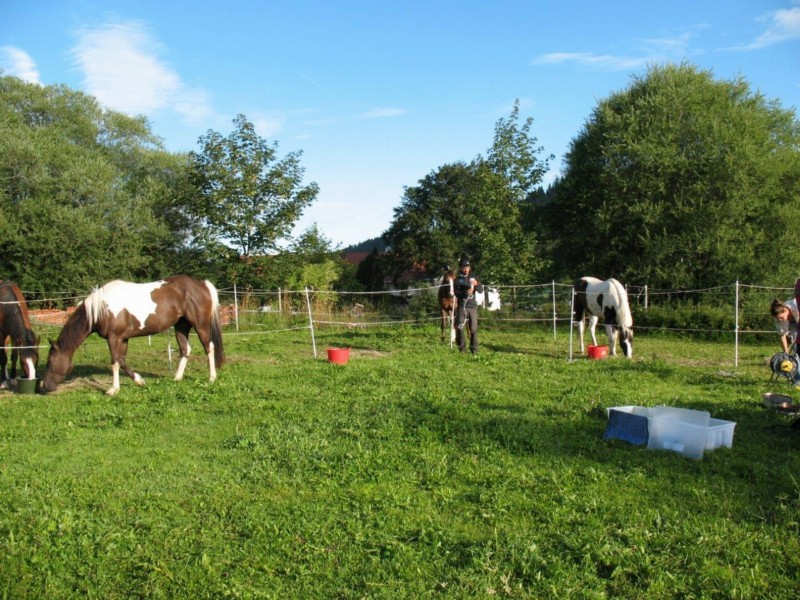 | Anbindemöglichkeit (Balken, Ringe) Mistwerkzeug vorhanden, Wassereimer vorhanden | Sitzgelegenheiten im Freien, direkte Sicht zu den Pferden Verpflegung auf vorherige Anfrage möglich |