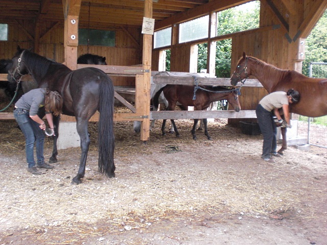 | Anbindemöglichkeit (Balken, Ringe) Mistwerkzeug vorhanden, Wassereimer vorhanden Plätze: 6 | Sitzgelegenheiten im Freien, Sitzgelegenheiten unter Dach, direkte Sicht zu den Pferden Mittagstisch/Warme Küche, Getränke |