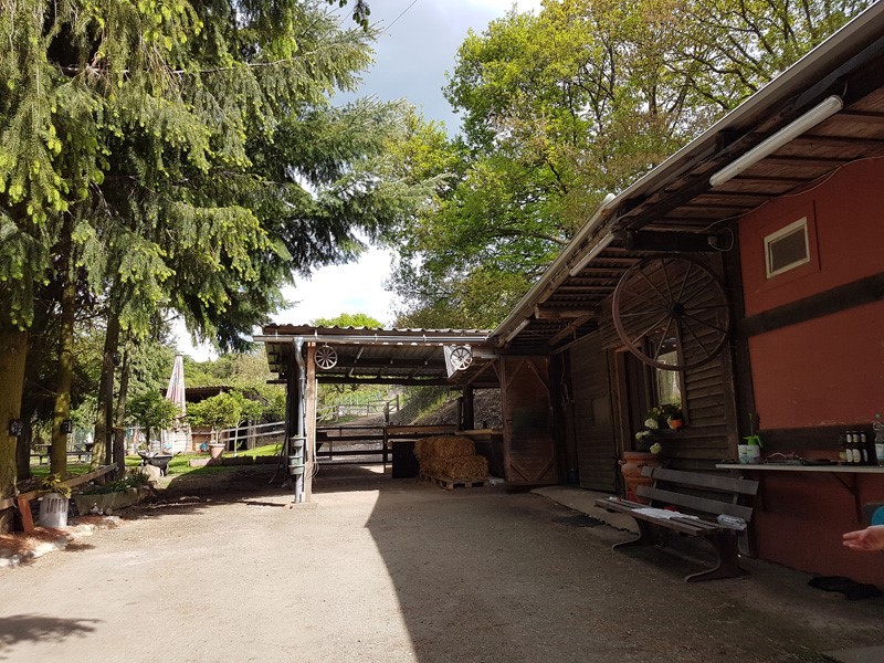 | Anbindemöglichkeit (Balken, Ringe), Bäume, Die Anbindemöglichkeit ist eingezäunt. Mistwerkzeug vorhanden, Wassereimer vorhanden ca. 10 (nach Verträglichkeit) | Sitzgelegenheiten im Freien, Sitzgelegenheiten unter Dach, direkte Sicht zu den Pferden Mittagstisch/Warme Küche, Brotzeit/Snacks, vegetarisch, vegan, Café, Kuchen, Eis, Getränke, Pfälzer Wildspezialitäten |