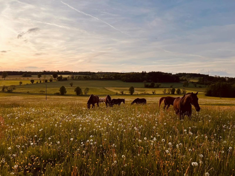 | Koppel, Koppel mit Unterstand Heu, Gras, Futter inklusiv, nach Absprache Plätze: 6 Preis pro Pferd: 20 | Direkt am Hof: Bettwäsche vorhanden, Fewo, Zelt Abendessen, Brotzeit, Frühstück, Lunchpaket, vegetarisch möglich, Getränke Plätze: 6 Preis pro Person: 40,00 Abendessen |