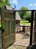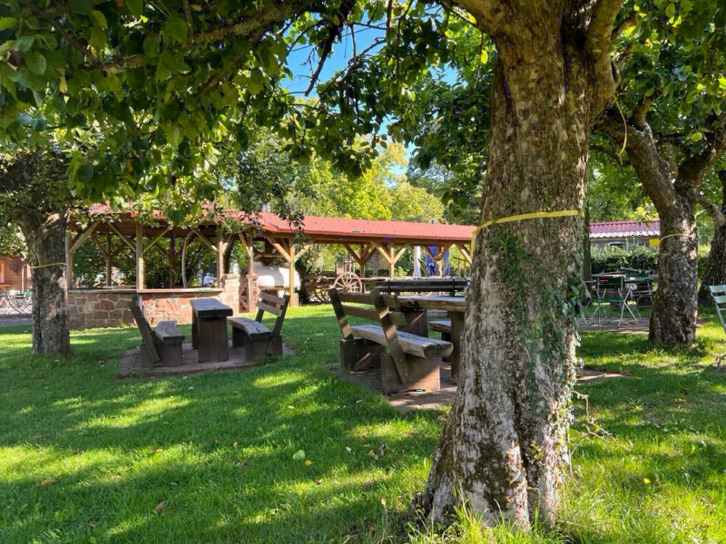 | Anbindemöglichkeit (Balken, Ringe), Bäume | Sitzgelegenheiten im Freien, Zwei Tische mit jeweils zwei Bänken |