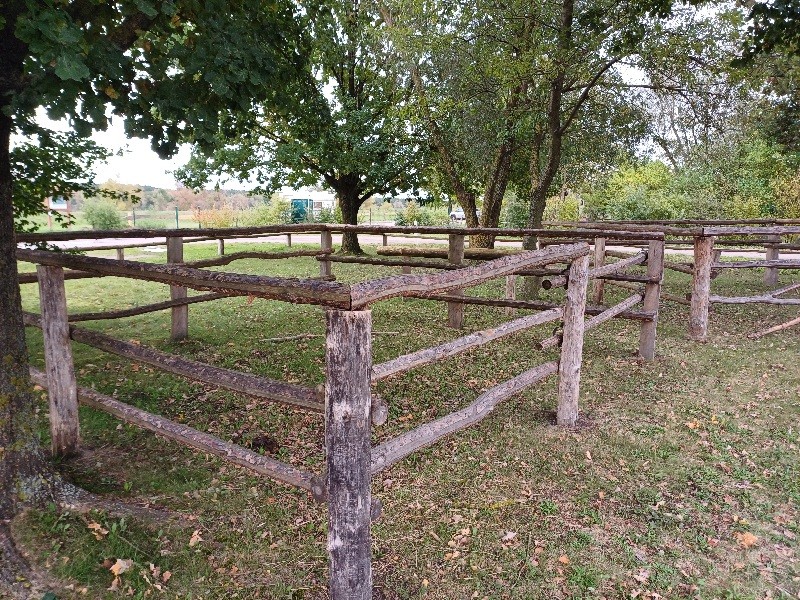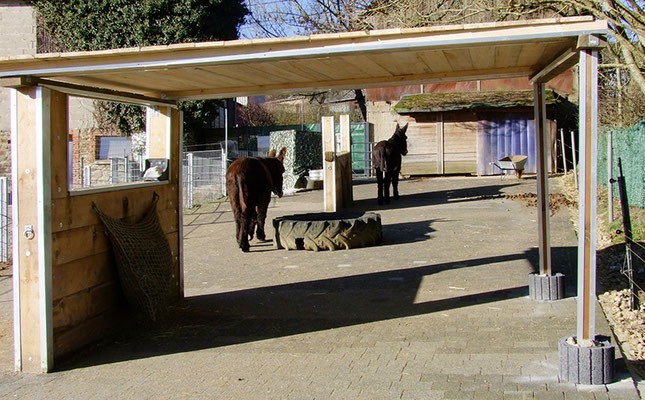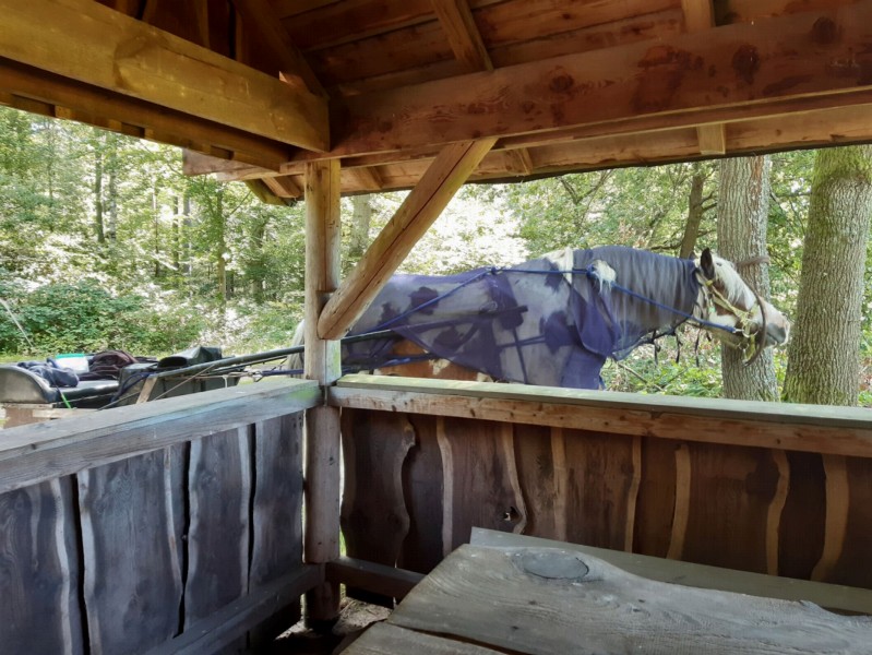 | Anbindemöglichkeit (Balken, Ringe), Stabile Pfosten der Schutzhütte ggf. Parkmöglichkeit mit Pferdeanhänger | Sitzgelegenheiten unter Dach, direkte Sicht zu den Pferden |