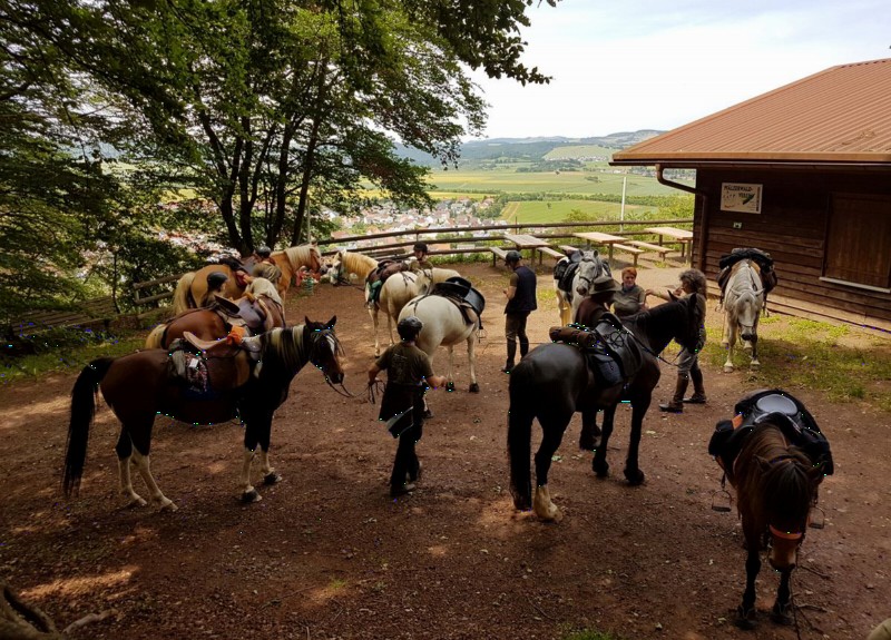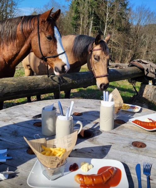 | Anbindemöglichkeit (Balken, Ringe), Bäume, Die Anbindemöglichkeit ist eingezäunt. Mistwerkzeug vorhanden, Wassereimer vorhanden ca. 10 (nach Verträglichkeit) | Sitzgelegenheiten im Freien, Sitzgelegenheiten unter Dach, direkte Sicht zu den Pferden Mittagstisch/Warme Küche, Brotzeit/Snacks, vegetarisch, vegan, Café, Kuchen, Eis, Getränke, Pfälzer Wildspezialitäten |