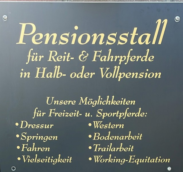 | Anbindemöglichkeit (Balken, Ringe), Boxen/Einzelpaddocks Mistwerkzeug vorhanden, Wassereimer vorhanden | Sitzgelegenheiten im Freien, Sitzgelegenheiten unter Dach, direkte Sicht zu den Pferden Mittagstisch/Warme Küche, Brotzeit/Snacks, vegetarisch, Café, Kuchen, Getränke |