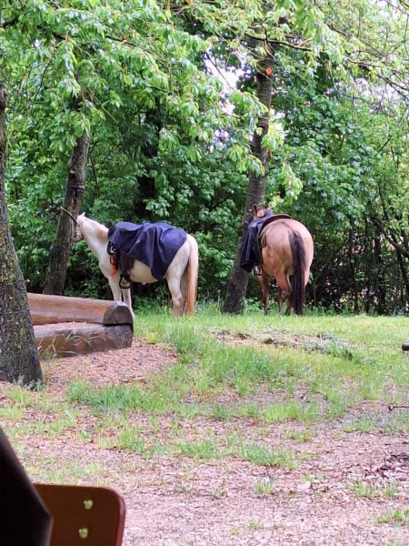 | Anbindemöglichkeit (Balken, Ringe), Bäume, Koppel Mistwerkzeug vorhanden, Wassereimer vorhanden | Sitzgelegenheiten im Freien, Sitzgelegenheiten unter Dach, direkte Sicht zu den Pferden, Trockene Aufbewahrung für Sattel/Gepäck Mittagstisch/Warme Küche, Brotzeit/Snacks, vegetarisch, vegan, Café, Kuchen, Eis, Getränke |